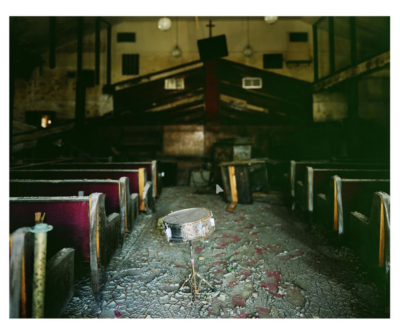 An image of the interior of a church after being flooded by Hurricane Katrina. The image looks down the mud-caked central aisle of the church towards the altar. Sitting in the middle of the aisle is a steel snare drum. To the left and right are pews, and further down the aisle are pieces of debris in front of the dais.